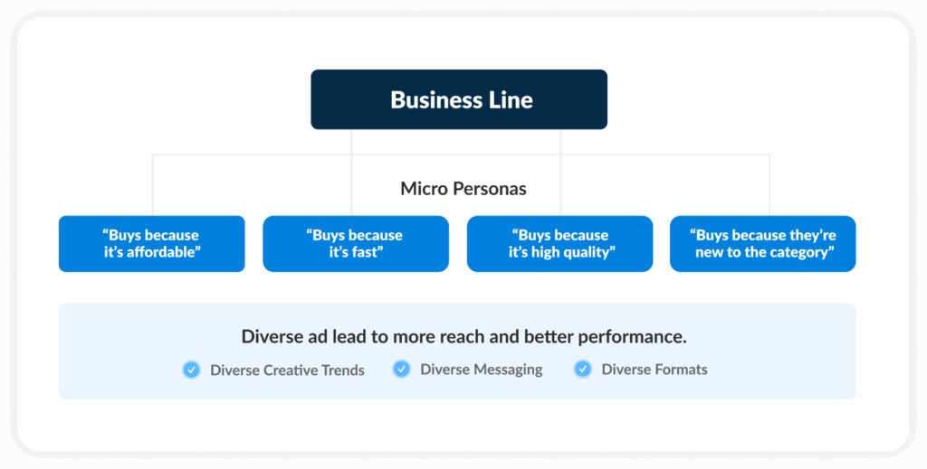 If your team only produces a handful of new ads each month, you’re not feeding the machine enough to sustain performance. Every business line reaches multiple micro-personas—people who buy the same product for different reasons. Andromeda can only learn those differences when you supply creative that speaks to each sub-audience.