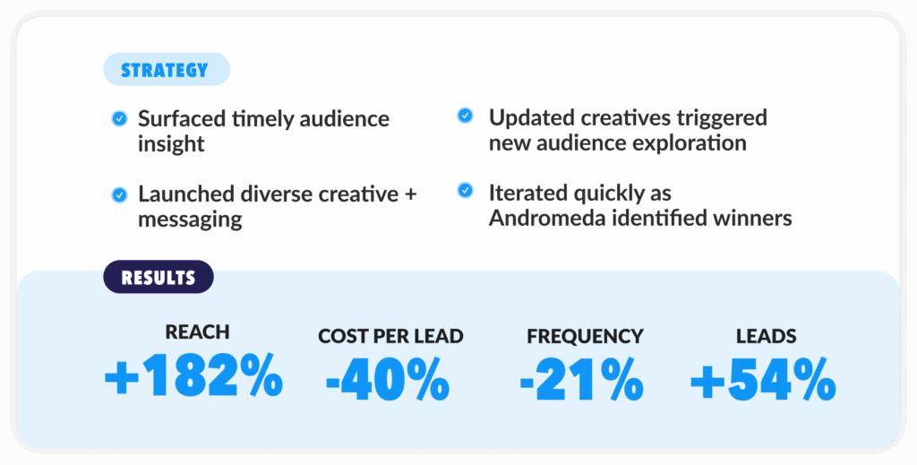 The hard part? Andromeda’s changes are nearly invisible in the interface. Your ads keep delivering, your metrics keep updating — but the underlying logic that decides who sees what has changed. By the time performance tells you something’s wrong, the algorithm is already weeks ahead of you.