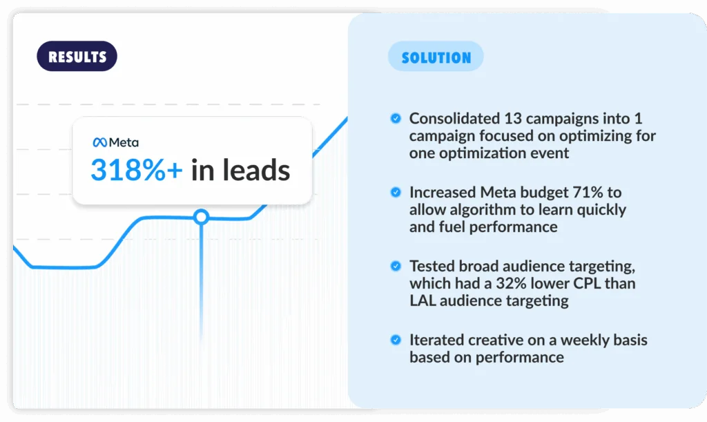 - Simplified structure: One campaign per objective, broad targeting, and multiple creative concepts per ad set so the system has room to learn.