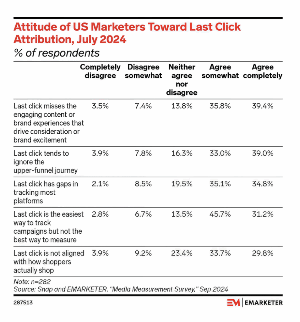 According to a 2024 eMarketer survey, 78.4% of marketers still use last click attribution to measure media effectiveness, but only 21.5% of markets are confident that it’s reasonably accurate.